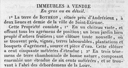 Le 11 octobre 1828, le Mercure Ségusien publie une annonce de vente du domaine. Parmi les atouts décrits : "prés, vignes, terres labourables, plantations et bosquets d'agrément, source et pièce d'eau." Les vignes sont citées comme argument commercial, aux côtés de trois tenements de "terres chambonnales de bonne nature", ces sols fertiles façonnés par les courbes de la Loire. Le domaine se vend avec sa vigne.